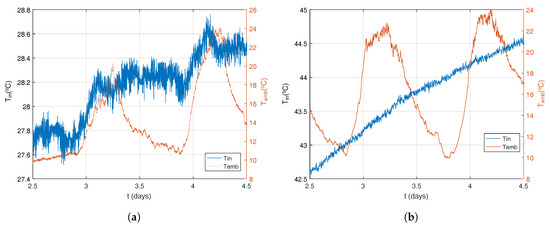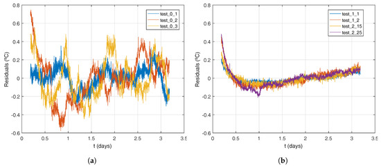For a deeper analysis of model adequacy, Figure 12 shows the evolution of residuals—the difference between predicted and actually measured data—with time for the FLS-LSQ models (the one that shows the best adequacy overall). If non-PID controlled tests are considered (Figure 12a), the residual timeline resembles the noisy pattern of the curves (as in Figure 4a). These ambient temperature influences may mask other effects, errors, or sources of information present in the residuals. Clearly, the use of a PID control reduces the residuals (Figure 12b) and isolates them from ambient effects. In Figure 4a a common pattern appears that only can be attributed to some systematic inability of the used models to capture some intrinsic system behaviour.