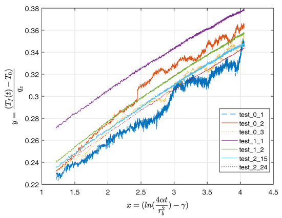 The linear form allows us to compare experiments made with different heat injection rates. Ideally, all possible TRT experimental data would fall on the same line in the y–x representation , if Equation (4) would hold strictly. We used, as undisturbed ground temperature, the value of C, derived from the extensive analysis of temperatures in the boreholes as described by [12]. This transformation result is shown in Figure 9.
