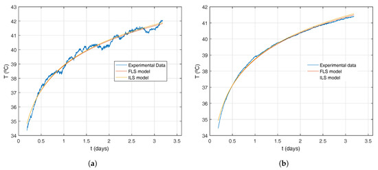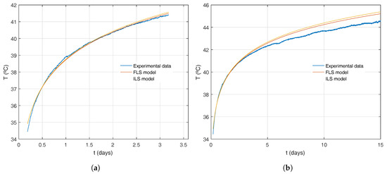 Figure 10 presents another interesting view, comparing optimized model prediction with measured data for two of the experiments with similar heat injection, without (Figure 10a) and with automatic PID control (Figure 10b). Qualitatively, theoretical and experimental results show a similar agreement in the rest of the analysed cases. Although there is seemingly a good correlation between theory and experiment, specially in Figure 10b, it can be appreciated that a slight systematic deviation is present at the end of the 3.5 day period, where experimental data tend to fall somewhat below the theoretical predictions of either ILS and FLS models. In the next section this effect will be discussed more in depth.