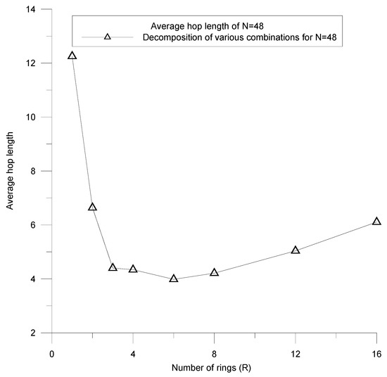 In the example of N = 48, there are eight decomposable multi-ring combinations except the cases (24, 2) and (48, 1) since at least three nodes are required to form a ring subnet. After calculating the various cases, the path length result of each combination is shown in Figure 1, which shows a minimum point when R = 6 with P = 8; this case achieves the minimum path length compared to all the other combinations. At the same time, the number of computations can be effectively reduced from eight to two if the constraint of R-P is set to four, thus improving the computation time required to determine the best configuration.
