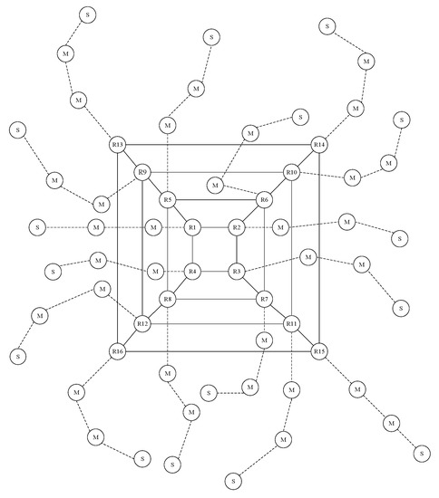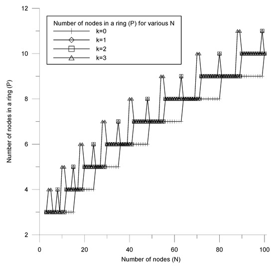 The smaller k for each N intuitively brings the R closer to the P. The resulting topology is more approximate to the symmetry deployment. However, when N is not decomposable, N decreases by 1 until the value can be factorized and the | P R | k constraint is satisfied. On the other hand, when N is decomposed into R and P, if | P R | does not satisfy the constraint, then N decreases by 1 until it can be decomposed into R and P. Finally, the optimal configuration with the least hop length can be decided, and the suitable combination of R and P can be found. In addition, the closer R and P can satisfy the | P R | constraint, the better is the formation of a more symmetrical multi-ring configuration.