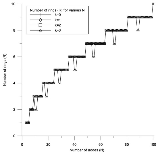 With k varying from 0 to 3, Figure 5 shows the performance of the optimal number of ring R for various N. The k = 3 case achieves the worst performance compared to the other three cases. In addition, the k = 0, 1, and 2 cases achieve the same performance concerning the optimal number of rings.
