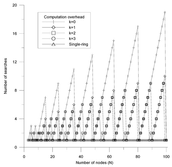The number of nodes in a ring P is determined by the number of nodes N over the number of rings R, and thus it is inversely proportional to R. Figure 6 shows that the performance of the number of nodes in ring P increases as the number of k increases for various N, and k = 0 achieves the least value of P. In the k = 0 case, R is equal to P, and this case achieves the optimal configuration among all other cases. However, it took more search cases than all other cases to locate the optimal R and P for various N, as shown in Figure 7, and the single-ring case performs with the least computation overhead. The computation overhead is defined as the number of search times for a random input N to be decomposable according to the constraint k and to locate the optimal number of ring configurations. The number of search cases decreases as k increases. As seen from the simulation, a trade-off exists between the computation overhead and the set value of k.