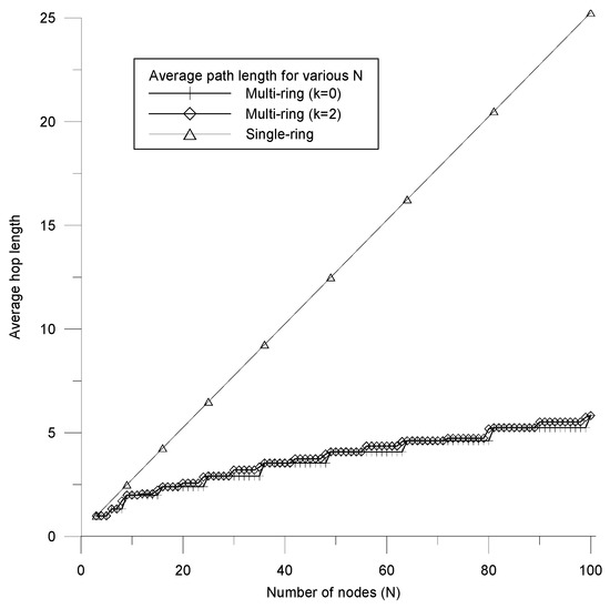 With the min-path algorithm, the optimal multi-ring configuration can be determined and the corresponding (R, P) sets with minimum path length generated. Figure 8 shows the average path length of the multi-ring for various N, and the k = 0 case achieves the shortest path length compared to the other two cases. The k = 2 case achieves almost the same hop length performance as k = 0, and both cases achieve superior hop length performance compared to the single-ring case. In addition, the increment slope of the average hop length for the min-path algorithm is much smaller than the slope of the single-ring case increases, because the near symmetrical deployment of the multi-ring subnet can be achieved under the constraint k.