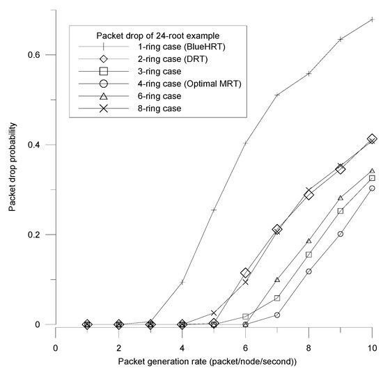 To estimate the impact of network congestion in a scatternet, a packet drop probability (PDP) metric was used. When the FIFO buffer overflows in each node, the damaged routing packets—including both the currently received and newly generated routing packets—are dropped. The PDP is defined as the ratio of the total number of dropped packets over the total number of generated packets for all nodes. Figure 9 shows the PDP of the six schemes, where the 4-ring case as the Optimal MRT achieved the lowest PDP compared to both BlueHRT and DRT cases. In addition, all the multi-ring tree simulation cases achieved better PDP performances than the traditional single-ring case in terms of BlueHRT. From the simulation results, it is clear that the roots and all other masters began to drop packets when the FIFO buffers overflowed.