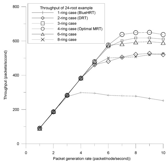 To reflect the scatternet capacity of the multi-ring tree, a packet throughput was used to evaluate network performance. The average packet throughput is defined as the ratio of the total number of successful routing packets over the total simulation time in seconds. The simulation results of the packet throughput for the 24-root of the multi-ring tree are shown in Figure 10. According to the simulation results, the 4-ring case as the Optimal MRT achieved the best throughput performance compared to the other five schemes, since the min-path algorithm can determine the optimal configuration with the minimum average path length for the multi-ring subnet. In addition, the routing packet throughput increased continuously as the packet generation rate increased, because the self-routing protocol combined with the multi-ring core network greatly improved the network routing performance compared to the BlueHRT and DRT cases. When the PDP starts as packet generation rate increases in Figure 9, the packet throughput almost reaches constant performance in Figure 10 and the network begins to be congested. As a result, the constant packet throughput can be regarded as the upper bound of network capacity for the multi-ring tree.