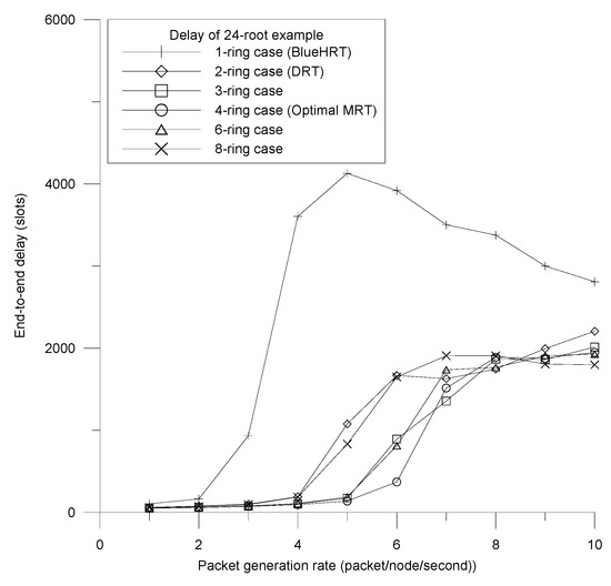 In order to evaluate the multi-hop routing performance, an average packet delay metric was adopted to measure the end-to-end delay of a scatternet. The average packet delay of each routing packet is defined as the average packet transmission time from the first transmitted bit at the source node to the last received bit at the destination node. Figure 11 shows the average packet delay performances of the 24-root of the multi-ring tree. The Optimal MRT case generated the smallest average delay in the simulated six cases when the packet generation rate was smaller than six, as the Optimal MRT generated the shortest path connectivity. In addition, the average packet delay increased quickly as the packet generation rate rose for each case, and the network experienced a saturation phenomenon when network congestion occurred for all cases. The saturation phenomenon decreased the end-to-end packet delay when the PDP started to increase in Figure 9.