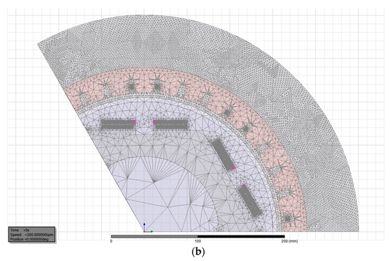 Mesh refinement in FEM analysis is critical, as a very fine mesh results in longer simulation time, and coarser mesh results in poorly resolved outputs. A trade-off was made in order to achieve reasonable accuracy within a practical time frame. Length-based mesh with an element size of 1 mm was chosen for field windings, stator conductors, and air gap. Coarse mesh with a larger element size of 3.5 mm was chosen for other parts (Figure 2b). The rotor core was left at the default mesh size set by ANSYS at > 3.5 mm, as it does not influence the effects being studied. The FEM simulation parameters are listed in Table 2. The use of the master-slave boundary condition helped with reducing the model size by making use of the symmetrical geometry of the machine [27].