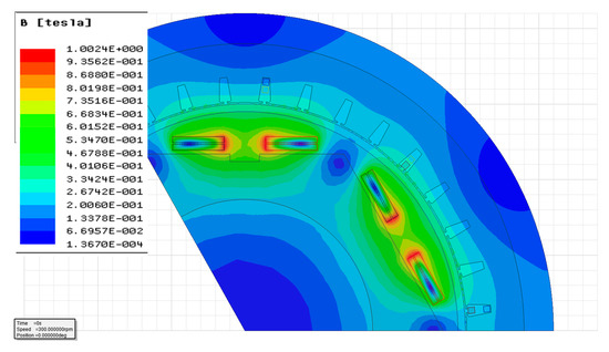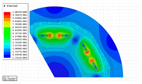 The field pattern with stator design 1 shows that the stator conductors corresponding to the same phase are at different field strengths (Figure 5). When the stator design changes, it is observed that the conductors corresponding to the same phase are in the same field strength, as required (Figure 12). The change in stator design resulted in an improvement in the harmonic performance of the machine. With the same meshing and boundary conditions as set for stator design 1, the change in the stator dimension and conductor placement strategy for a G-10 stator yoke resulted in a significant improvement in the harmonic performance; these results are shown in Table 7. The decrease in the harmonic distortion validates that field uniformity is one of the important factors in ascertaining a better harmonic performance.