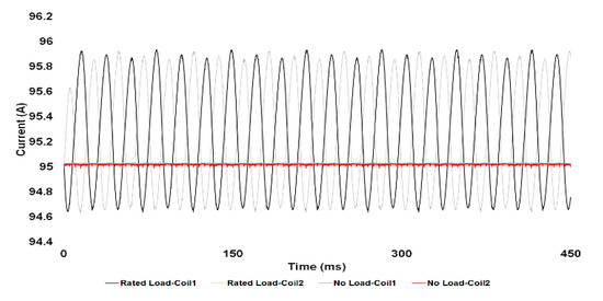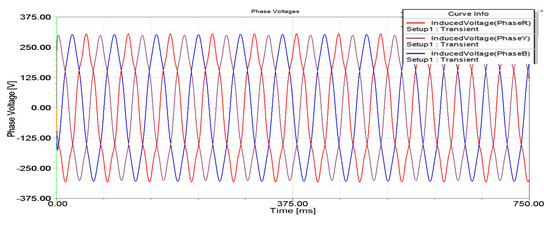 The harmonic performance of the HTS generator has been examined for “no load” and “rated load” conditions. The HTS generator in this discussion is aimed at implementation for wind-based power generation. In wind turbines, the best-suited alternator winding configuration is Star at the start-up in order to support an easy initial spin at high voltage and low current. The winding is switched to Delta once the speed has picked up to boost the current levels [32]. However, for low speed generation, as in this case, a fixed Star winding configuration for the alternator windings is deemed suitable.