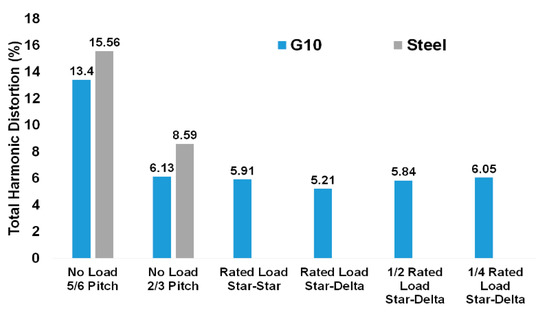 As discussed in Section 3, since the winding pitch is a critical factor in tuning the harmonic performance [33,34,35,36], results are analysed for two different pitches. The THD for the 2/3 pitch configuration is significantly reduced when compared to the 5/6 pitch configuration for both steel and G10 stator yokes. The reason for this improvement is the successful elimination of the third harmonic component (Figure 7). Based on these results, for further simulations, the stator yoke material was selected to be G10, and the winding pitch was selected to be 2/3.
