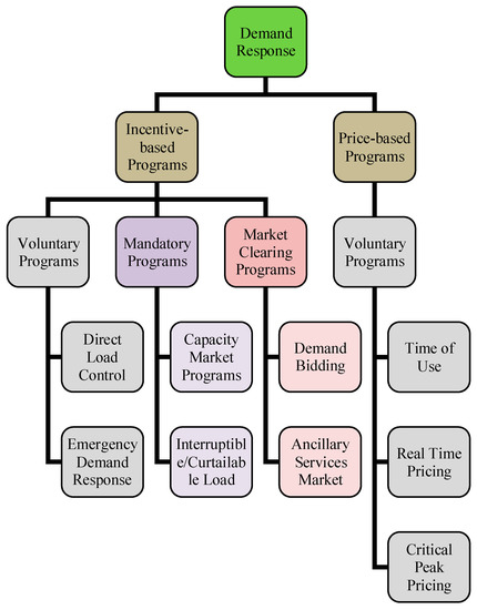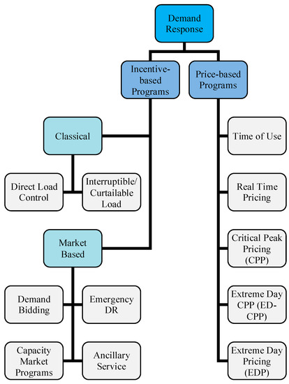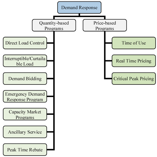 Each of these groups consists of several programs. These DR programs are discussed thoroughly in [33]. According to the literature, DRPs are also divided into price-based or quantity-based programs. PBDR programs strive to decrease the customer’s energy demand through price changes. IBDR programs or Quantity-based programs, strive to reduce end-users demand through direct utility control of the main loads at home such as air conditioners, electric heaters, and/or pumps [34].