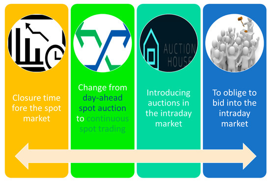European electricity markets are mainly day-ahead spot markets which lead to considerable demand for balancing services or intraday markets to handle excess generated wind and difficult conditions resulting from wind energy. The impact of wind energy on market prices in various markets such as day-ahead and intraday markets have been the main topic of many papers, including [5,42,43]. Therefore, the question of acceptable and proper market design has frequently been studied, particularly in [44,45,46,47]. The majority of these contributions capture attention either in the spot market or the balancing market. A noticeable exception is [47], which simulates the link thoroughly and relates the intraday and the balancing markets. The fundamental aspect which this paper has focused on is the liquidity under a wide range of variates of market designs, for spot as well as for intraday markets. The main purpose of any improvement process in the market is to achieve better conditions in market design which should improve and enhance the markets’ efficiency.