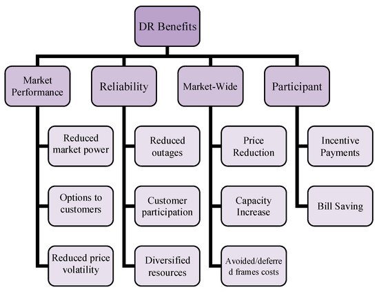 In Figure 6 [3] the benefits associated with DR are summarized; the DR benefits are clustered around four main collections: participant, market-wide, reliability, and market performance benefits. The benefits of DRPs are not only for the ones who get involved in programs; some are market-wide. Finally, market prices are reduced as a result of employing most of the infrastructure, for instance, reduction in units’ demands with expensive electricity generation. DRPs exert a powerful effect on pushing down the market prices [40,73]. Furthermore, DRPs can expand short-term capacity through incentive-based programs which in sequence, leads to keeping down capacity costs. Reliability is considered as a subcategory of the DR benefits because it affects all the market. Due to the importance of reliability, it is considered an individual category. Through an accurately modeled DR program, participants can help to decrease the risk of outages. Consequently, participants diminish the risk of being faced to enforced outages and/or electricity interruption.