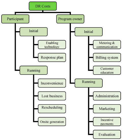 Every DRP includes various types of costs; Figure 7 depicts clustering of DRP costs, where both DRP implementers and participants at the demand side suffer from initial and running costs [77]. Participants might be required to buy some new digital technologies, in addition to installing and deriving DR programs: intelligent thermostats, controlling peak loads, energy management systems, and in place generation units. A set of response decisions as a plan or strategy requires scheduling therefore it can be implemented as an event. These basic and primary costs are usually born by customers who take part in programs; nevertheless, high-tech assistance and other paraphernalia should be supplied through the program.