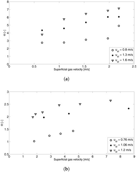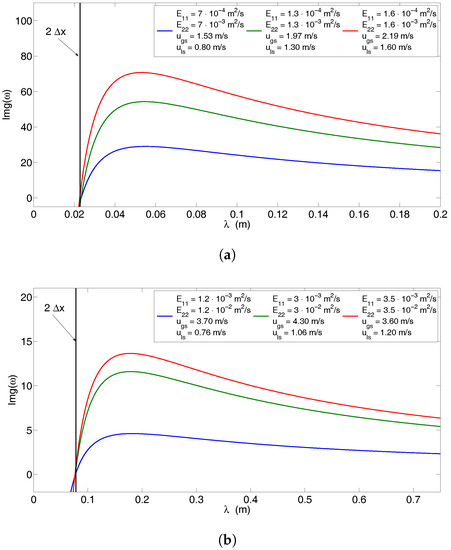 Figure 3 shows, for the investigated geometries and for different couples of superficial velocities, the amplification factor Img() as a function of the wavelength, which is defined as the imaginary part of the propagation velocity [23,33]. If Img() > 0, the corresponding wavelengths are amplified; if Img() < 0, they are damped. The values of and are the minima necessary to obtain a cut-off wavelength no higher than one pipe diameter, and they are specific for each couple of superficial velocities.