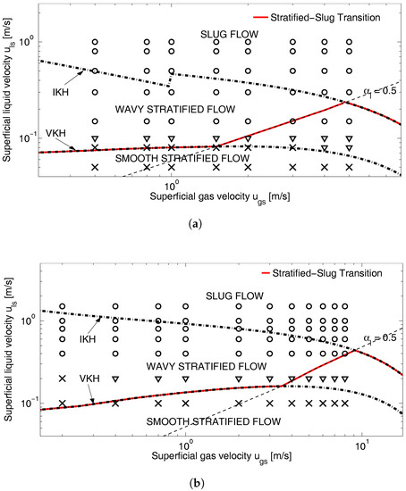 Figure 4 shows that the code predicts the transition from stratified to wavy flow and from wavy to slug flow. It is possible to observe that, except for two points in Figure 4b, all of the smooth stratified results are under the VKH line, and then, before obtaining the slug flow regime, the transition to the wavy regime takes place; above the IKH line, the slug regime is obtained, as expected from theory.