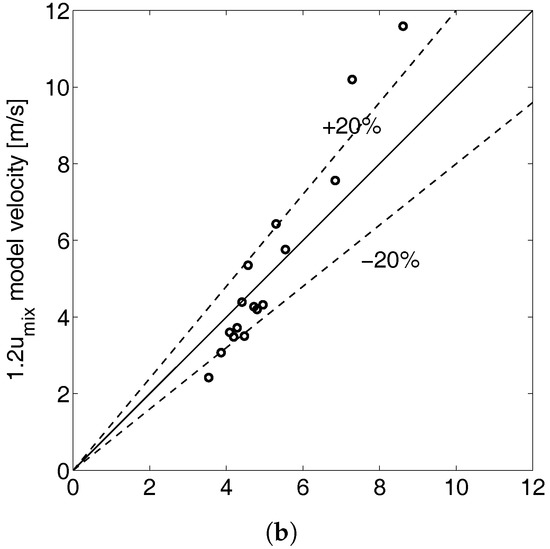 Figure 5a shows, on the left, the comparison of the slug mean velocities obtained numerically by the two-equation model and the measured ones, for the geometry Pipe1, while Figure 5b compares slug computed translational velocities, in the case of Pipe2, and the predictions given by the relation reported in [47]; their correlation (, where is the distribution parameter and is the drift velocity) is for bubble velocity, but we adopted it under the hypothesis that the slug front moves at the same speed of the bubble before it; according to [47], we consider for turbulent flow (the case of this study) and for horizontal flow. In both the cases, the agreement between the numerical results and the experimental data (or empirical prediction) is satisfactory, since they are within the lines. Moreover, at the right-hand side of Figure 5a, we show that the computed slug velocities (black rings) follow accurately the trend predicted in [47] (blue line).