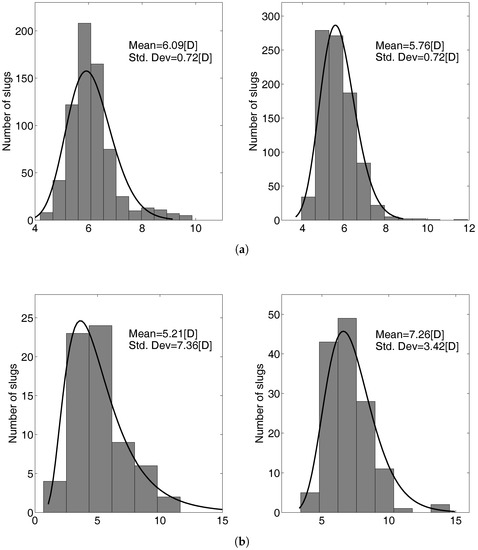 The computed slug body length distributions are reported in Figure 7: the typical log-normal distribution identified by experimental observation [49] is reproduced (the log-normal curves displayed in Figure 7 were fitted to the numerical data: the obtained mean and standard deviation are reported for each of the four cases). As concerns Pipe1, the experimental evidence indicates that the slug body lengths are typically in the range of 10–20-times the pipe diameter, while for Pipe2, the typical slug lengths are around 12–30 pipe diameters. In Figure 7a,b, we can see that the computed slugs are shorter than the ones observed experimentally, but that the statistical behavior of the distribution is preserved.