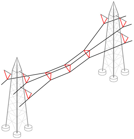 A discrete analysis is needed to obtain the cable modelling solution. In addition, this type of procedure with finite elements allows the introduction of concentrated forces, necessary for the correct development of this work. A simple algorithm for the cable modelling and its solutions is detailed in the cited paper. An iterative procedure evaluates: (i) the forces f1,1, f1,2, f1,3 that satisfy the condition , where L (m) is the line length; and (ii) the wire 3D disposition.