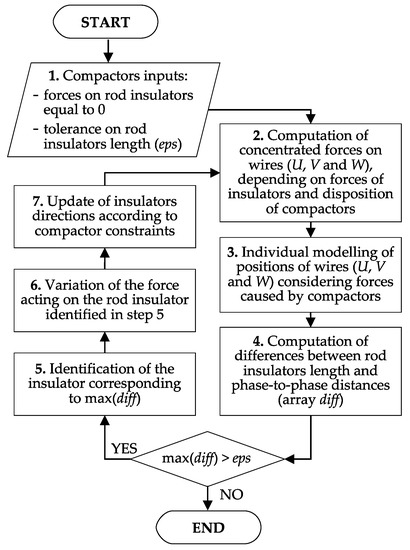 According to the base theory, the insertion of rigid elements between two conductors in a specific point of the span (imposing the phase-to-phase distance equal to the rod insulator length) is difficult to be directly implementable in the mathematical formulation of the overall problem. Conversely, the evaluation of the conductors distance trend along the span can be obtained a posteriori in two steps: (i) imposing the forces exerted by the insulators (in module and direction); and (ii) computing the resulting layout of each phase conductor through the single wire modelling (where stresses introduced by compactors are applied as concentrated loads). For this reason, the proposed resolution strategy basically consists in an iterative algorithm that modifies step by step insulators angles and applied forces, following a defined criterion. The entire system, including tower insulators, phase conductors and added compactors, is solved through the iterative procedure briefly depicted in the flow chart of