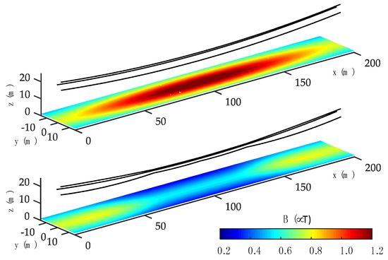 Figure 5 represents the magnetic induction field on a plane 1 m above the ground level in EDS conditions, without (above figure) and with compactors (lower figure). In the studied configuration, it is interesting to note that the magnetic induction in the span center is mitigated from 1.24 µT to 0.55 µT (−55.6%). Furthermore, with compactors, the magnetic induction decreases moving from towers (where the phase-to-phase distance is higher) to the center of the span (where approaching phase conductors compensates the lower distance between wires and the ground level). Differently, the area close to the span center is the most critical in the case of traditional installations.