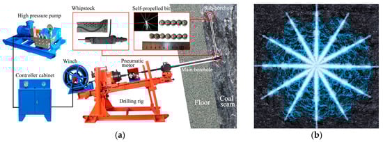 The equipment needed for tree-type fracturing in underground coal mines is shown in Figure 1a. First, a cross-layer borehole is drilled from a floor roadway into the coal seam. This borehole is called the main borehole. Second, a whipstock is installed at the end of the main borehole and the whipstock’s outlet aimed parallel to the bedding in the coal seam. Next, a self-propelled bit is introduced into the whipstock and negotiates the turn to go into the coal seam. This self-propelled bit is designed [17], so that it can break the coal in the seam and, using high-pressure water jets, drill a sub-borehole the length of which can be as much as 10 m. The bit moves forward under its own self-propelling force generated by backwards-facing water jets. By changing the position and orientation of the whipstock, a number of sub-boreholes can be drilled in the coal seam forming the tree-type fracturing net. When all drilling has been completed, the main borehole is cased and sealed and hydraulic fracturing is started. Initiated along the lengths of the tree-type sub-boreholes, hydraulic fractures propagate to form a tree-type net of fractures in the coal seam, as shown in Figure 1b.