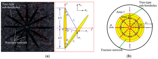 Controlling fracture propagation under different principal stress directions and inducing complex fractures between tree-type sub-boreholes is the key to success for tree-type fracturing. Assuming the distances between sub-boreholes are equal and taking two adjacent sub-boreholes as examples, based on the theory of elastic mechanics, the analysis of the stress induced by hydraulic fractures is a plane strain problem. According to a plane strain model, the geometry of the two-dimensional stress field can be obtained (Figure 2a). The difference in induced stress at any point can be expressed by Equation (1) [18,19]: