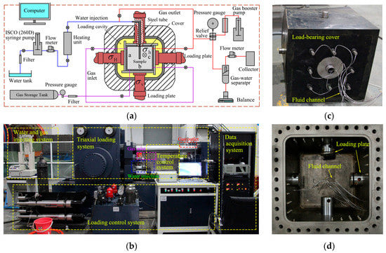 All experiments were carried out using a large-scale true-triaxial hydraulic fracturing test apparatus. The apparatus is shown in Figure 3a,b. It was specifically designed to be able to simulate in situ ground stresses and pore pressures in order to carry out HF and gas seepage experiments. The apparatus is composed of five main subsystems, namely the triaxial loading system, a load control system, water and gas injection systems, a temperature control system, and a real-time data acquisition system. An ISCO-260D syringe pump (Teledyne ISCO, Lincoln, NE, USA) with a maximum pressure of 51.7 MPa and a maximum flow of 107 mL/min is used for water injection. The triaxial loading and control system can apply a confining pressure of 0–25 MPa. In the vertical direction, the loading stress is equal to the confining pressure. In the axial and lateral directions, four independent mechanical loads can be imposed on the sample via electro-hydraulic servo pumps. Mechanical loading stresses can range from 0 to 35 MPa. Therefore, the stresses on the sample from the axial and lateral directions are equal to the mechanical loading stress plus the confining pressure. The accuracy of the stress control is ±1%. The oil in the confining pressure cavity is temperature-controlled and can maintain sample temperatures ranging from 20 to 100 °C. Test samples are sealed with a load-bearing cover on which there are gas inlets and outlets for gas seepage. Combined, these features mean the fracturing apparatus is capable of simulating HF under true-triaxial stress, pore pressure, and temperature conditions. It can also be used to conduct gas seepage experiments on reconstituted or fractured samples to monitor both the connectivity of hydraulic fractures and any improvements in permeability. During the experiments, the confining pressure, axial and lateral stresses, injection pressure, temperature, and strain were monitored and recorded by the real-time data acquisition system.