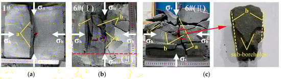 The induced stress values calculated from Equation (2) under experimental conditions are shown in Table 1. Comparing the calculation results of samples #2, #3 and #4, the induced stress increases with the horizontal stress difference increasing under the certain construction parameters of tree-type drilling. When the horizontal stress difference (4 Mpa, 5 MPa) is less than the induced stress (5.69 MPa, 5.23 MPa), it shows that fractures are induced around the sub-boreholes and propagate to the adjacent hole. After propagating a certain distance, the fractures change direction to propagate along the direction perpendicular to the minimum principal stress. When the horizontal stress difference is increased to 6 MPa, greater than the induced stress (3.80 MPa), there are only main fractures formed at the ends of the sub-boreholes perpendicular to the minimum principal stress direction. When the horizontal ground stress difference is more than induced stress (sample #4) and the test apparatus cannot form complex fractures, increasing the number of sub-boreholes to 4 or 6 (samples #5 and #6) will increase the induced stress to 6.88 MPa or 7.64 MPa, greater than the horizontal stress difference again. This results in the formation of reticular fractures (Table 1, Figure 4).
