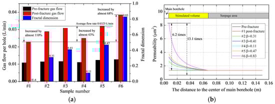 Gas seepage experimental results after tree-type fracturing. (a) Gas flow rates and fractal dimension; (b) Permeability.
