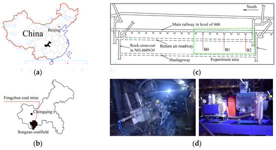 Maps showing the location of the field test study site and photographs of the drilling equipment. (a) Location of Chongqing province in China; (b) Location of the Songzao coalfield and the Fengchun mine, Chongqing province; (c) Plan showing the roadway layout of mining area No. 8 and the location of the roadway for gas drainage below the mechanical roadway in the Fengchun mine; (d) The equipment used for tree-type drilling.