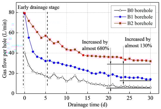 The CBM drainage rates and the total amount of CBM drained from boreholes B0, B1 and B2 were vastly different. As shown in Figure 7, at first the gas drainage rates from boreholes B1 and B2 were both close to 80 L/min. The initial drainage rate after traditional fracturing in borehole B0 was about half as fast. After 30 days, the rate from the B1 borehole had reduced to 14.04 L/min. However, the rate of drainage from the B2 borehole attenuated relatively slowly. After 30 days, the drainage rate was still as much as 31.92 L/min, about 2.3 times that of the B1 borehole. Comparing tree-type fracturing with the traditional fracturing, the gas extraction from the tree-type fractured borehole remained at a high level for a much longer time than did gas extraction from the conventionally fractured hole. This shortened the gas drainage time and improved the overall efficiency of gas extraction.