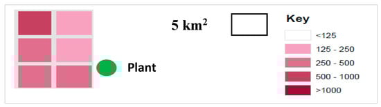The AD centralized plant was assumed to be located in the Cheshire region and that the required slurry feedstock for its operation was supplied by using the waste of farms up to 1000 cows located in a 6.7 km × 6.7 km area, as displayed in Figure 1.