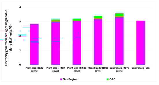 The specific power generation per kg of VS, estimated as the ratio between the power output of the gas engine and the ORC and the total amount of volatile solids contained in the waste fed to the AD reactor, is presented in Figure 2 for the different plant sizes under consideration in this article. Table 4 presents a detailed summary of the plant performance in term of energy outputs and fuel inputs.