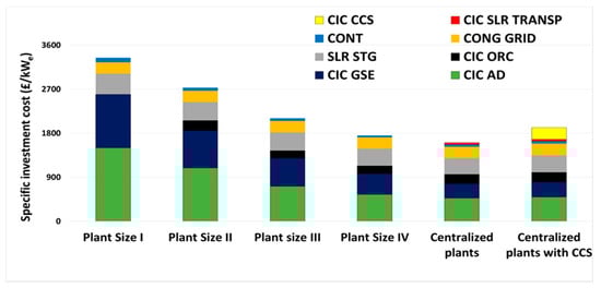 Specific investment cost for the different plant sizes.