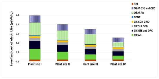 Figure 4 displays the levelized cost of electricity for the different plant sizes and the individual cost elements that make up the total levelized costs. It is apparent that the Operation and Maintenance costs make the larger contribution, followed by the other major elements of total capital costs. This is because it was assumed that the operation and maintenance cost for the AD reaction system accounted for 7% of the capital investment cost, based on [48,49]. Thus, for a life time of 20 years, the maintenance cost is higher than the capital investment cost for the reactor. Negative cost contributions are presented in the plot as a consequence of the payment for heat generation used for the supply of thermal energy for the farms (RHI).