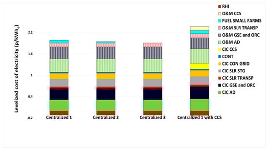 For the Centralized option with CCS, a larger contribution of the capital investment costs for the AD reactor and for the gas engine can be observed in comparison with the other centralized pants under study. This is due to the fact that less electricity is generated (lower power generation output leads to a higher levelized cost of electricity for the same capital investment cost). Under the current scheme, the feed-in tariff is approximately 5% larger than the levelized cost for this plant configuration, whilst the feed-in tariff valid until 31 March 2017 was 276% higher than the levelized cost of electricity.