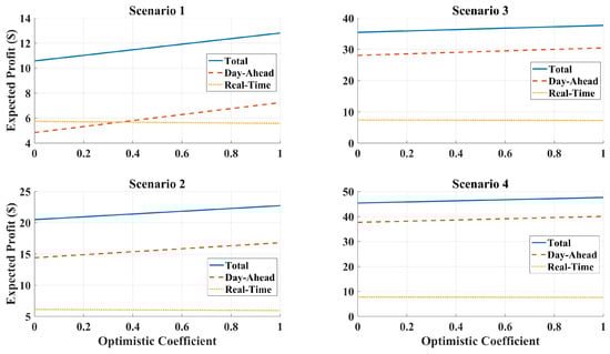 The impact of ESSs on the total, day-ahead and real-time expected profits of the system is shown in Figure 1. Furthermore, the influence of the optimistic coefficient, , is evaluated in Figure 1. From this figure, it is clear that an increment of increases the total and day-ahead expected profits because can directly affect the power produced by the PV system through interval bands in the day-ahead stage. Hence, increases the power generated from the PV panels in the day-ahead stage and the day-ahead expected profit. However, has a negative impact on the amounts of the real-time expected profit. Moreover, the expected profit of the system is maximum in Scenario 4. In other words, increasing the energy flexibility of the system increases the total, day-ahead and real-time expected profits of the system. Hence, the maximum and minimum amounts of the expected profit are in Scenarios 4 and 1, respectively. Furthermore, the expected profit in Scenario 3 is more than Scenario 2 because the ramping rate of the EV is more than the battery. Therefore, the EV can provide more energy flexibility than the battery in this proposed system.