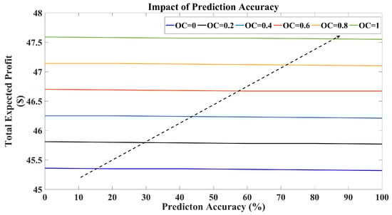 According to Figure 2, the impact of the prediction accuracy on the total expected profit is evaluated based on the optimistic coefficient. Furthermore, an increase in the prediction accuracy has a smooth negative effect on the expected profit. In other words, an increment in the prediction accuracy causes a decrease of the managed power of the PV in the proposed DEMS. Hence, this decreases the expected profit of the system. According to this assessment, the maximum amount of the total expected profit of the system is where and the prediction accuracy equal one and zero, respectively.