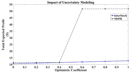 In this section, the modeling of uncertainty is evaluated through a comparison of the InterStoch method and MSPB. Although the InterStoch method has been defined in this paper, MSPB has been defined in [18,19]. For simplicity, only the battery has been considered, and is equal to zero in this section. The amounts of total, day-ahead and real-time expected profits are compared in optimistic and conservative cases based on the InterStoch and MSPB methods. As seen in Table 5, the optimistic case of both methods is where equals one. However, the pessimistic case based on the InterStoch and MSPB methods is where equals zero and 0.4, respectively, as seen in Table 6. Table 5 and Table 6 show that the difference between the amounts of the expected profits in the optimistic and conservative cases based on the InterStoch method is less than the MSPB method. Besides, Figure 3 shows the impact of on the total expected profit in both methods. Figure 3 also illustrates that the worst case of the DEMS based on the InterStoch method is where equals zero, and there is a linear pattern between the increment of the optimistic coefficient and the total expected profit when uncertainty is modeled by the InterStoch method. This point makes the system easier to analyze and more reliable, as it is able to further mitigate the uncertainty, dealing with it in away that its impact on the expected results is highly reduced. Moreover, the amount of the total expected profit in the worst case of the InterStoch is less than its amount in the worst case of the MSPB method. Hence, the InterStoch method is more robust than the MSPB method to model uncertainty in the proposed domestic energy management problem.