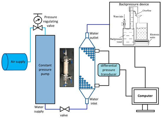 A plunger-type constant pressure water pump was used in the water supply system powered by an air compressor. By adjusting the pressure regulating valve, various flow rates and pressure gradients were established. The key component of the measurement section was a backpressure device, which was connected to the water outlet joint. It has three functions. Firstly, it keeps the air bubbles out of the experimental section. Secondly, it contributes to the formation of a stable water head difference. Thirdly, it reduces the impact of water on the electronic scales. This quality method was adopted for measuring flow rate experimentally. In other words, the flow mass was measured using an electronic balance with a storage tank on it. The experimental data were recording by a data collection software in the computer every 3 s.