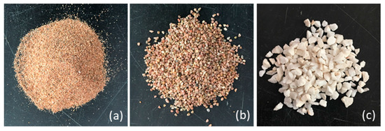 Nine different size granular media were selected for the seepage test. The wind-blown sand, river sand and crushed quartz specimens were used in the seepage properties test, as shown in Figure 3, which were separated by a high-frequency vibration screening test sieve machine [38]. The material properties of the specimens are shown in Table 1.