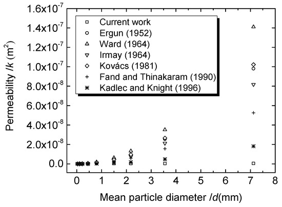 - The permeability increases exponentially with particle diameter for the case of fluid flow through a particle-packed medium. A ‘discount effect’ for permeability should be caused by the non-spherical shape and roughness of the particle. A suitable equation of permeability was obtained experimentally: