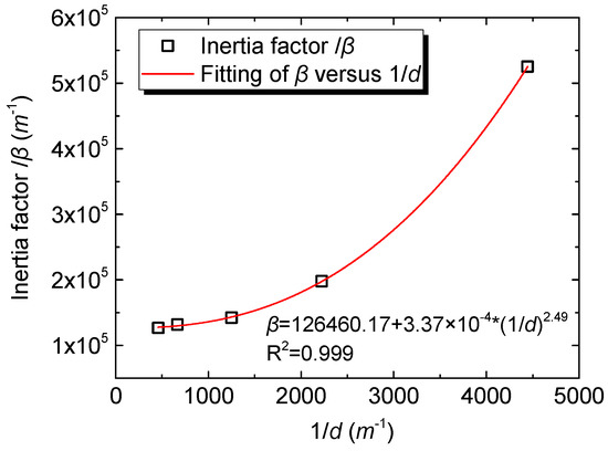 The coefficient of the quadratic term, also known as the inertia factor, is related to the geometry of the solid porous medium, which contains the information of tortuosity in flow path [59]. For the case of the porosity media in the matrix of spheres, the denser packing in smaller spheres results in smaller flow passages and larger solid surfaces, even though the porosity remains practically the same as the porous media with larger spheres, which is likely to increase fluid adherence to flow. In addition, the winding of flow passages is considerably greater within smaller spheres, which is likely to increase form force to flow. Hence, the permeability k is proportional to the particle diameter square d2. In contrast, the inertia effect reduced with an increase in particle diameter, i.e., the inertia factor β is inversely proportional to the particle diameter d. These relationships had been verified by Huang et al. [33] (see their Figure 7 and Figure 8) in their experiment for the case of fluid flow in cubic arrays of smooth spheres. A similar result has been reported by Sedghi-Asl et al. [34] (see their Figure 5) for the case of rounded aggregates packed into a column.
