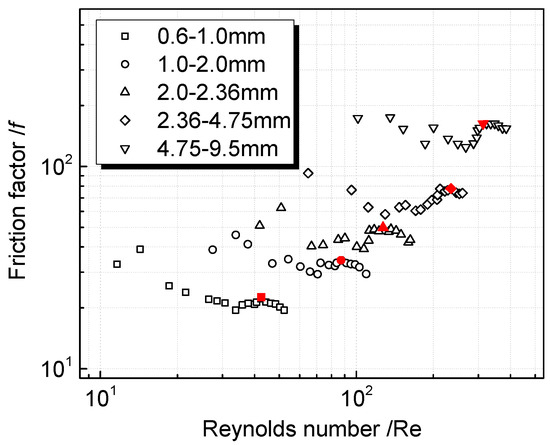 In Figure 9, friction factor is plotted as a function of Reynolds number by experimental data of columns (e)–(i). The red data points represent turbulent onset. As depicted in Figure 9, friction factor does not depend monotonically on the Re. The friction factor increases with an increase Re for a narrow range. A similar situation has been reported by many investigators. They suggested that the behavior represents the transition zone between Forchheimer and turbulent regimes [57,62,63].