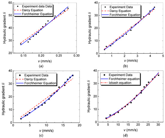 Figure 10 presents the hydraulic gradient i compared to superficial velocity v, which is correlated using three fulmars: Darcy’s law (Equation (5) shown in Table 5), Forchheimer equation (Equation (6)) and power law (Equation (7)). It is worth noting that in our test, the flow regime of packed column (a) is mostly pre-Darcy regime with a particle diameter range of 0–0.075mm. To date, there is no precise information regarding the lower boundary and there is a lack of experimental data for the pre-Darcy regime. Fand et al. [47] point out that the published data indicated that the lower limit of Darcy region is less than Re = 10−5. Some investigators suggest that the pre-Darcy regime has a wider range than Darcy’s law and proposed the upper limits based on seepage tests in columns packed with spheres of different sizes (e.g., Re < 0.3 for 3 mm beads; Re < 0.6 for 6 mm beads obtained by Kececioglu et al. and Jiang et al. [48]; and Re < 0.72 for 3 mm spheres and Re < 9.65 for 1 mm spheres obtained by Bağcı et al. [50]). However, the lower limits and the expression of the pre-Darcy regime is still controversial. Therefore, we described the pre-Darcy regime using Darcy’s law for the meantime, with the results listed in Table 5.