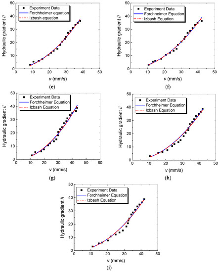 Relationships between hydraulic gradient and superficial velocity: (a) 0–0.075 mm; (b) 0.075–0.15 mm; (c) 0.15–0.3 mm; (d) 0.3–0.6 mm; (e) 0.6–1.0 mm; (f) 1–2 mm; (g) 2–2.36 mm; (h) 2.36–4.75 mm; and (i) 4.75–9.5 mm.