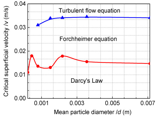 In the engineering practices, the particle diameter and fluid flow velocity are easily accessible. For the current work, a relationship between the critical velocity of flow transition and the mean particle diameter is displayed in Figure 11, with three flow fields exhibited. The Darcy’s law region has very low velocity in the range of 0 < v < 0.015 m/s. As the velocity gradually increases, the Forchheimer equation begins to dominate with the lower boundary being v = 0.018 m/s and the upper boundary being 0.035 m/s. However, the critical velocity begins earlier (e.g., at v = 0.011 m/s) for finer particles. Following the upper boundary of the Forchheimer region, the flow regime moves gradually into turbulent flow and the velocity becomes larger than 0.031–0.0345 m/s, which is more suitable for Equation (8). According to the changes in trends displayed in Figure 11, the critical velocity of the Forchheimer flow or turbulent flow might be lower when there are finer granules. However, by increasing the particle diameter, the critical velocity tends to remain constant.