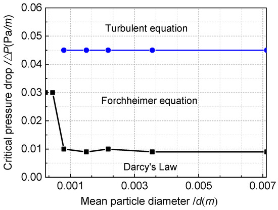 Flow fields based on the critical pressure drop against particle diameter are displayed in Figure 12. The critical pressure drop between Darcy flow and Forchheimer flow was 0.03 MPa for the wind-blown sand (0–0.6 mm granular size) and 0.009–0.01 MPa for the river sand and crushed quartz (0.6–9.5 mm granular size), respectively. As the flow pattern becomes completely turbulent, the values of pressure drop criterion was 0.045 MPa for a granular size of 0.6–9.5 mm. Furthermore, the value should be much higher than 0.06 MPa for the wind-blown sand (0–0.6 mm granular size). Concerning the results displayed in Figure 12, we could conclude that the particle-packed medium with finer particles consumed much higher energy than that with larger granules during the flow transition.